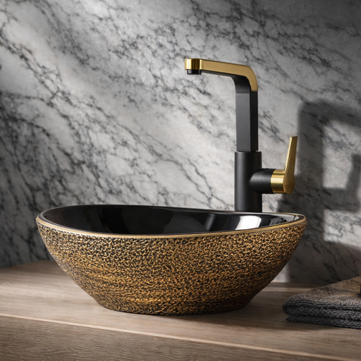 Design-Waschschale aus Keramik – Oval 56 × 40 cm, Schwarz mit Vintage-Gold Rand